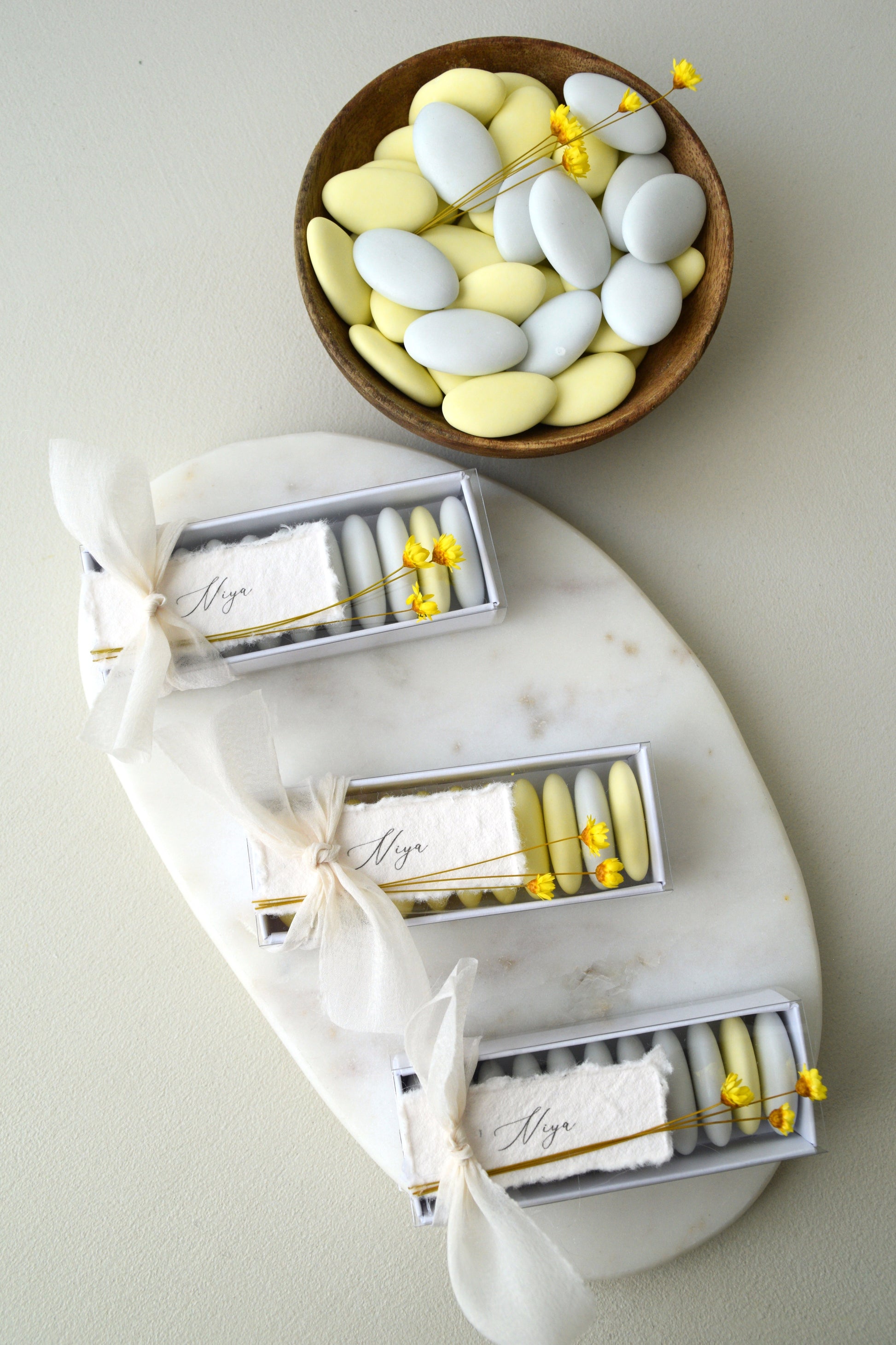This festive Sweet Little Lemon candy boxes are the perfect favor for your baby shower. Filled with a combination of yellow and white candy, they create a playful color contrast that immediately catches the eye. Beautiful dried yellow flowers adorn the top of the box, tied with a delicate chiffon ribbon, a fresh and elegant touch that perfectly complements the rest of the collection.