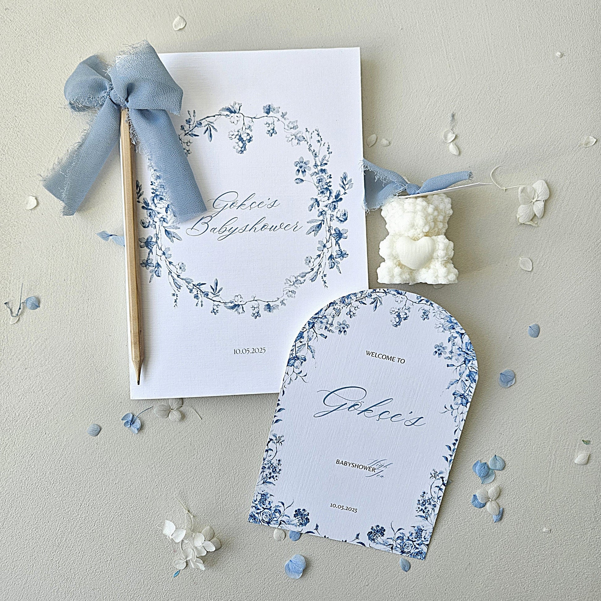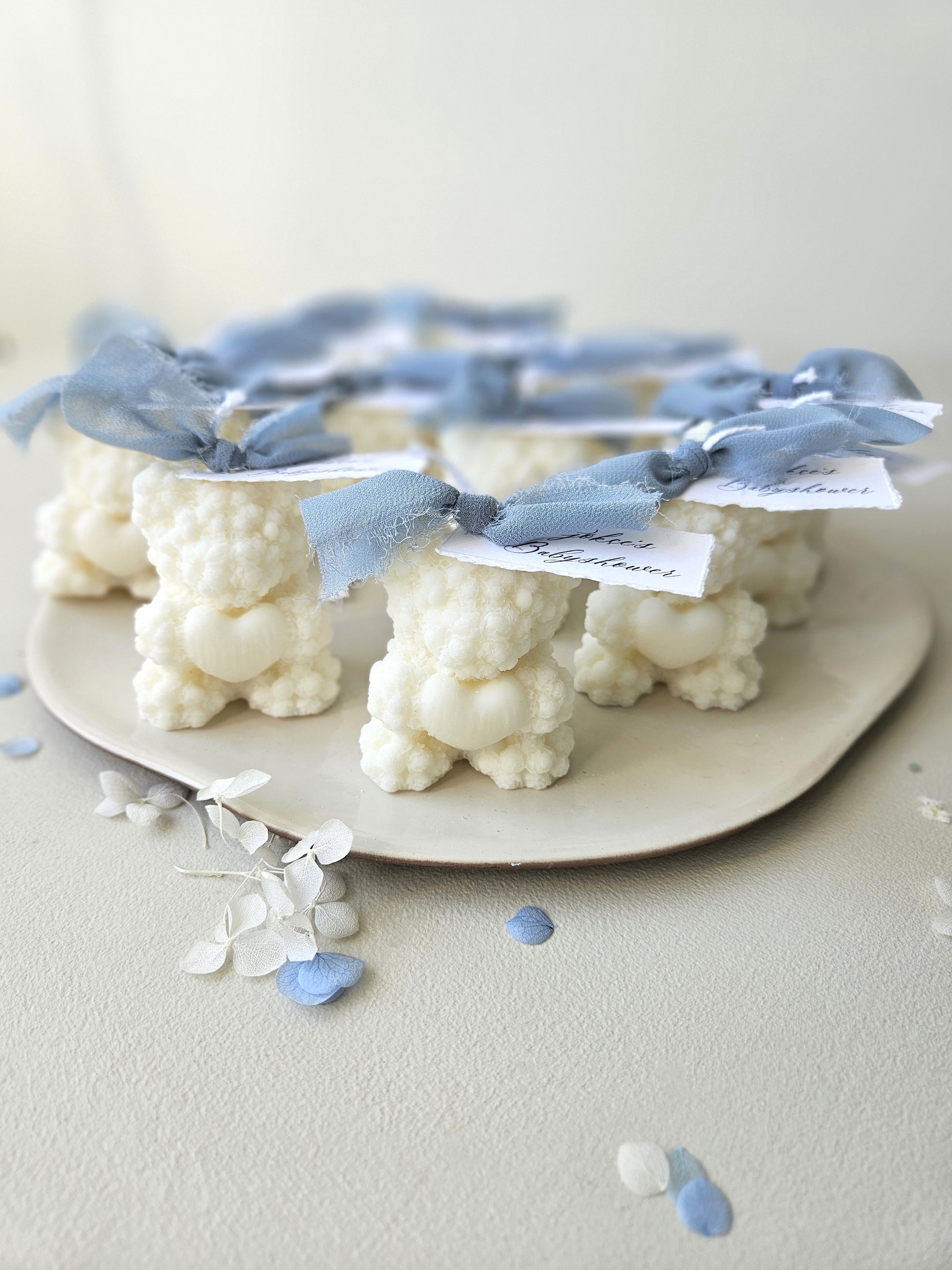 This enchanting candle favor from the Little Amsterdam collection is guaranteed to steal the show. Shaped like a sweet bear with a delicate floral design, this candle exudes softness and elegance. It's finished with a blue chiffon ribbon, perfectly complementing the classic charm of the collection.