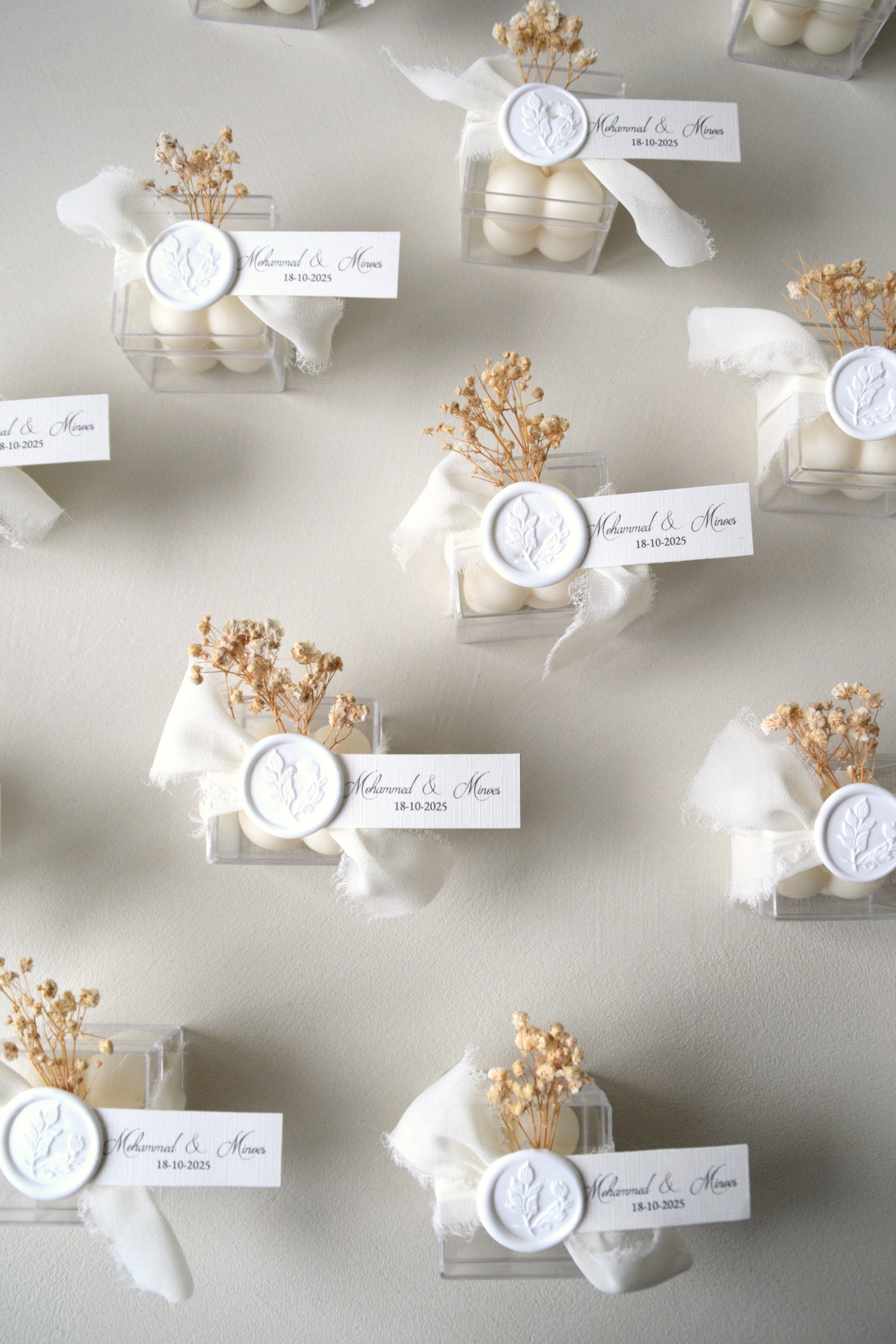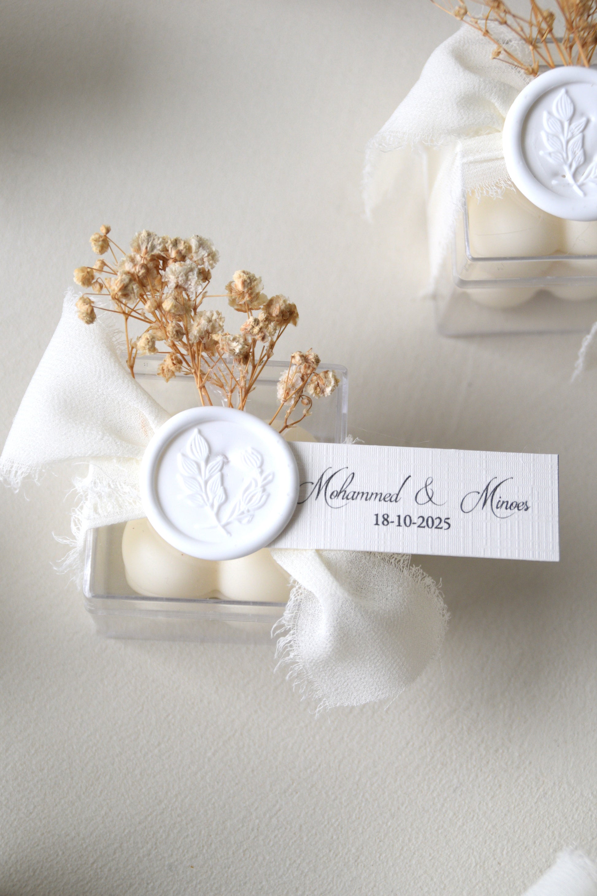 This refined candle favor from the The Safha of Baby's Breath collection exudes pure serenity. The transparent packaging reveals soft, ivory-white candles, symbols of warmth and light. Each box is carefully finished with an off-white chiffon ribbon, a subtle sprig of baby's breath, and a handmade wax seal with a floral motif. A personalized label makes this favor even more special. Perfect as a favor for weddings, engagement parties, or bridal showers.