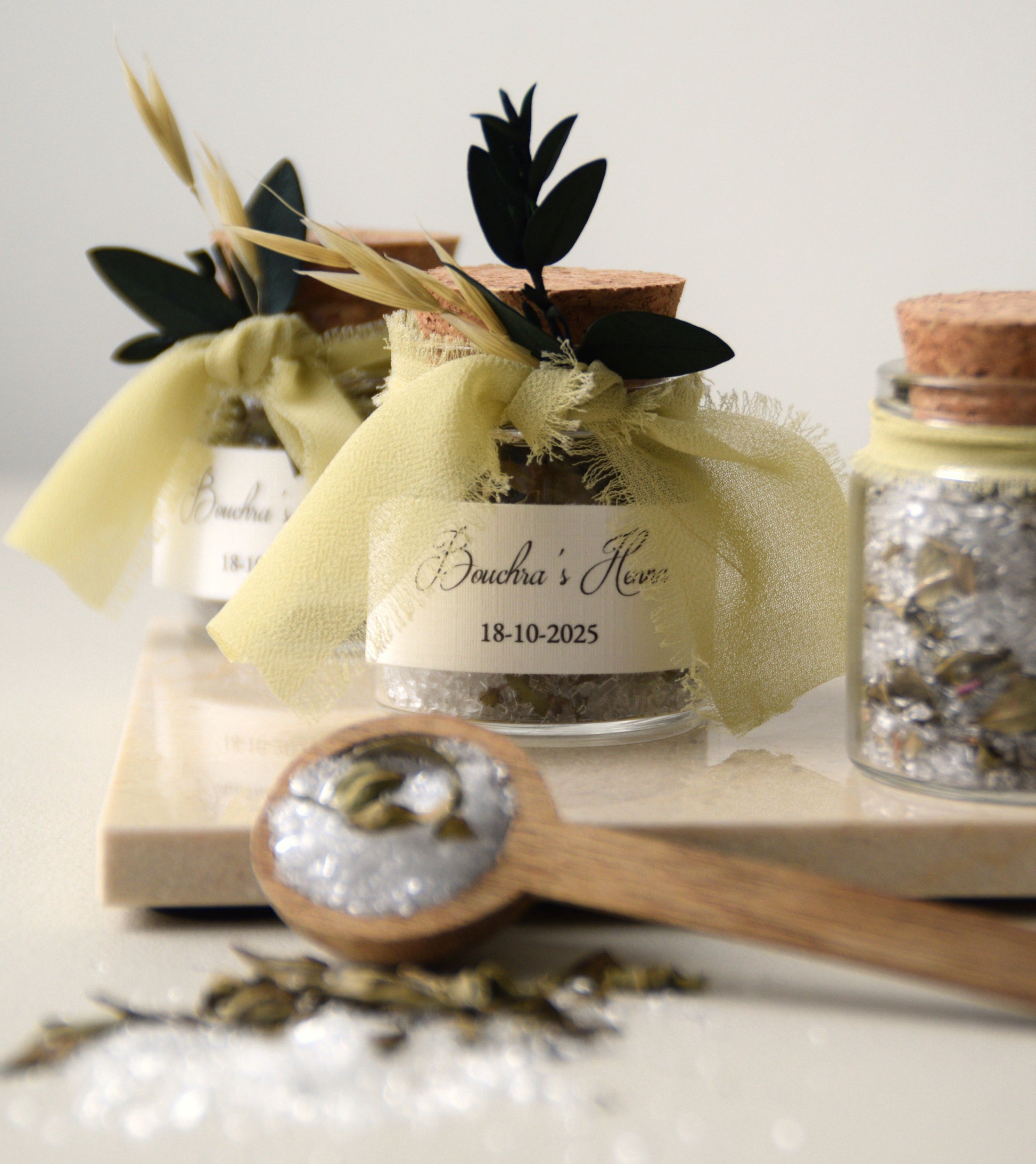 This beautiful bath salt favor from the Safha of Henna collection is a refined combination of relaxation and culture. The glass jar with a cork lid is filled with a luxurious blend of soothing bath salts and organic henna leaves, known for their nourishing and softening properties on the skin.