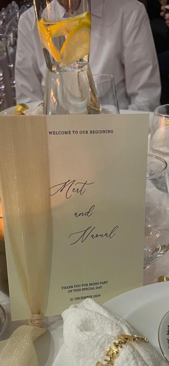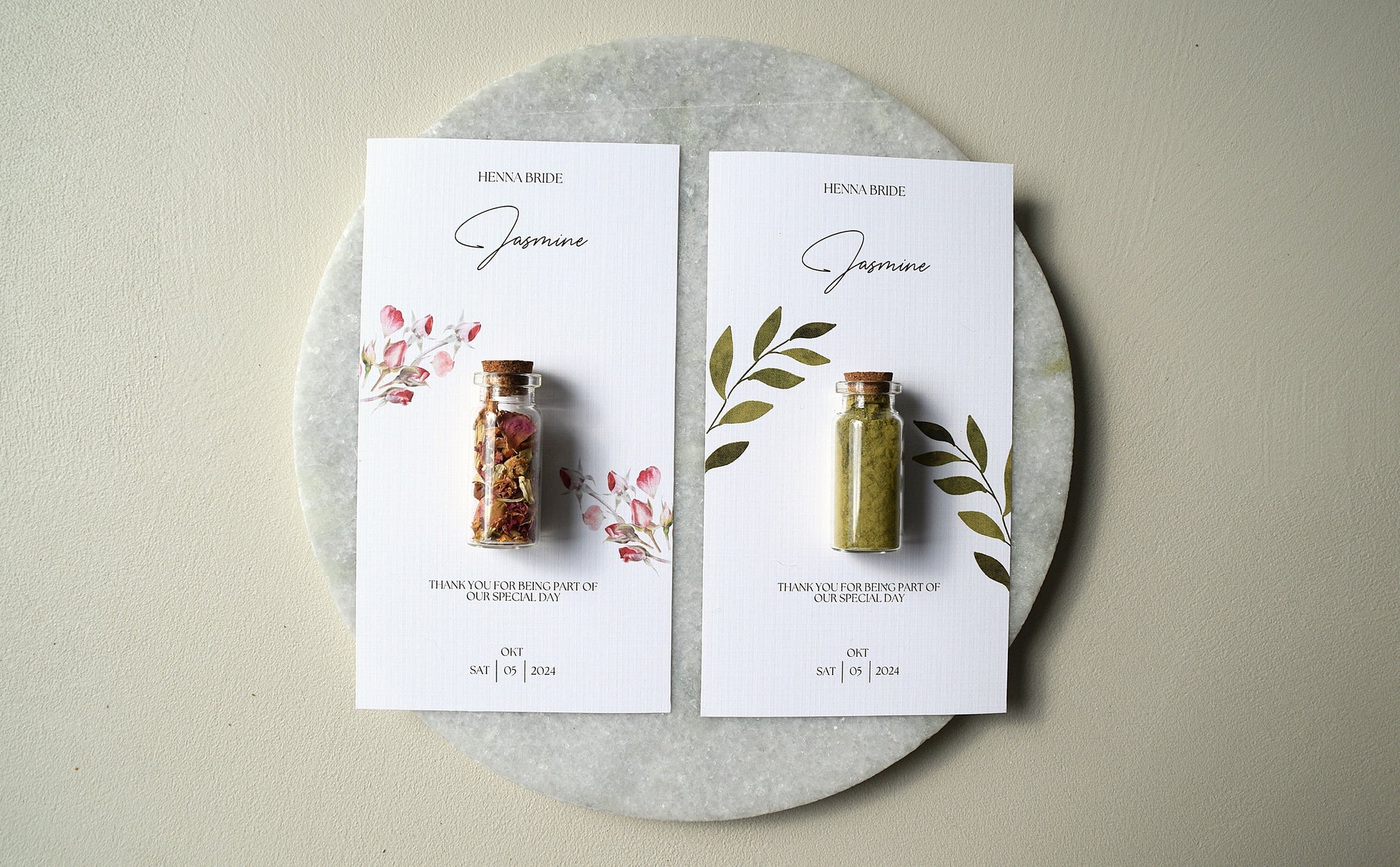 This unique place card from the Safha of Henna collection is a real eye-catcher. A small glass bottle filled with fine henna powder or organic henna leaves is attached to the center. A subtle nod to the meaningful henna traditions.