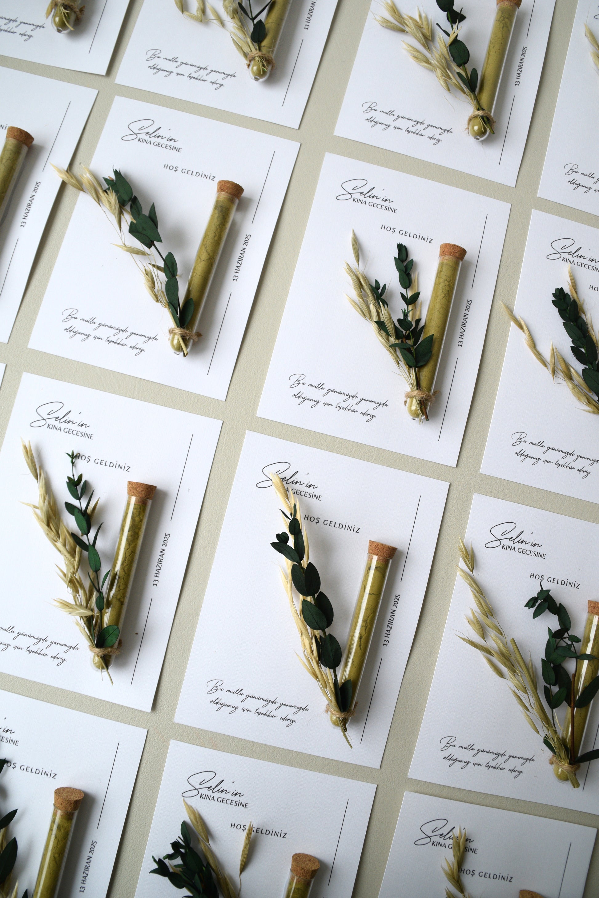 The Place cards from the Safha of Henna collection symbolize warmth, hospitality, and craftsmanship. Each card is paired with a henna tube, carefully decorated with dried twigs and leaves, creating a natural and stylish look.