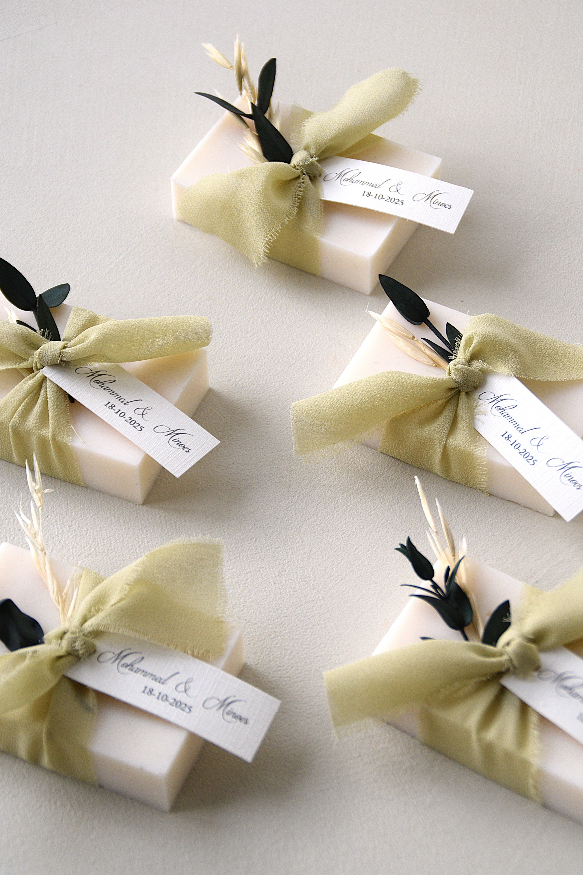 The soap favor from the Safha of Henna collection exudes simplicity, softness, and tradition. With the warm scent of sandalwood, a personalized label adorned with the same dried leaves and a light green chiffon ribbon, this favor forms a harmonious whole within the collection.