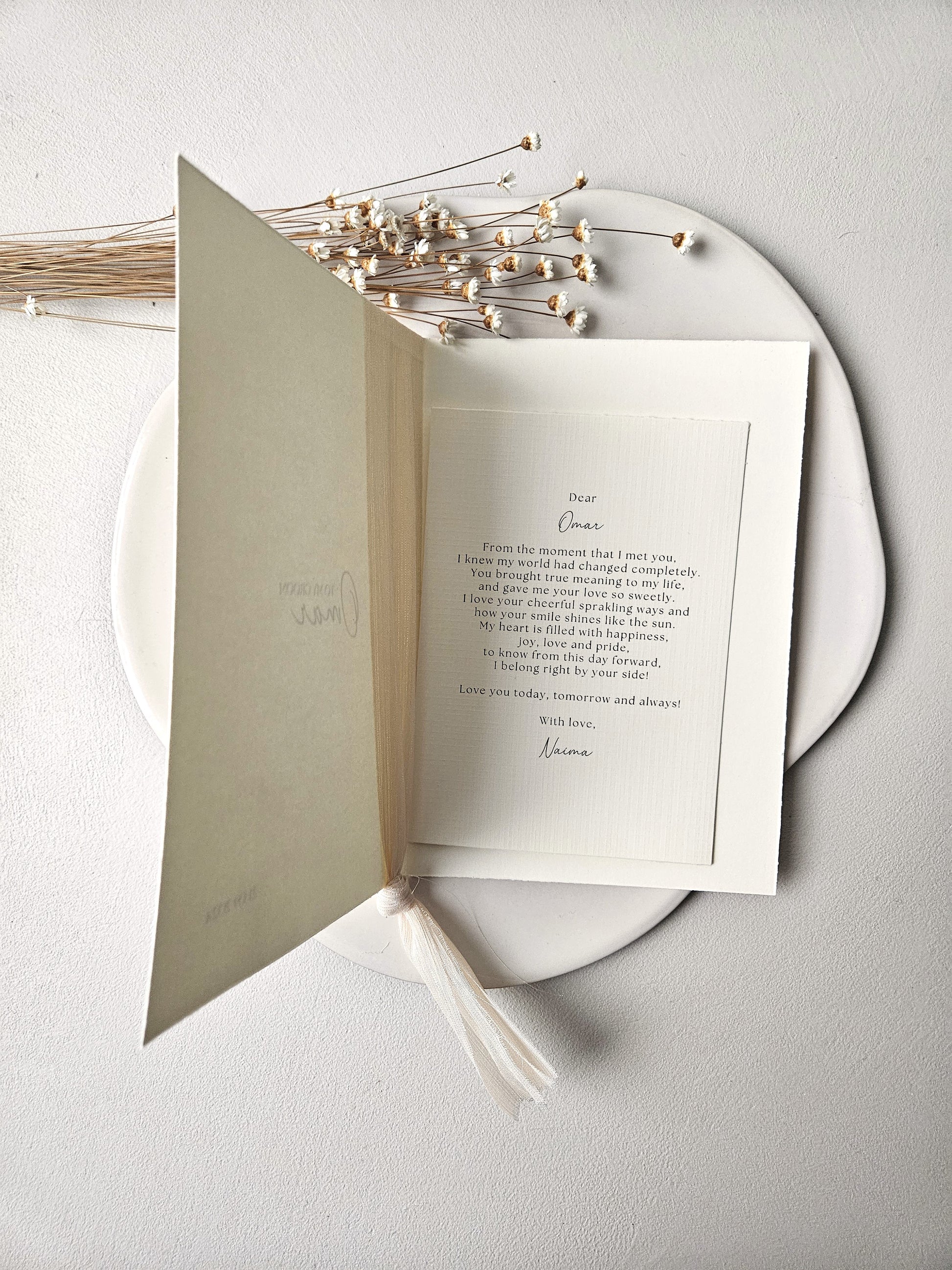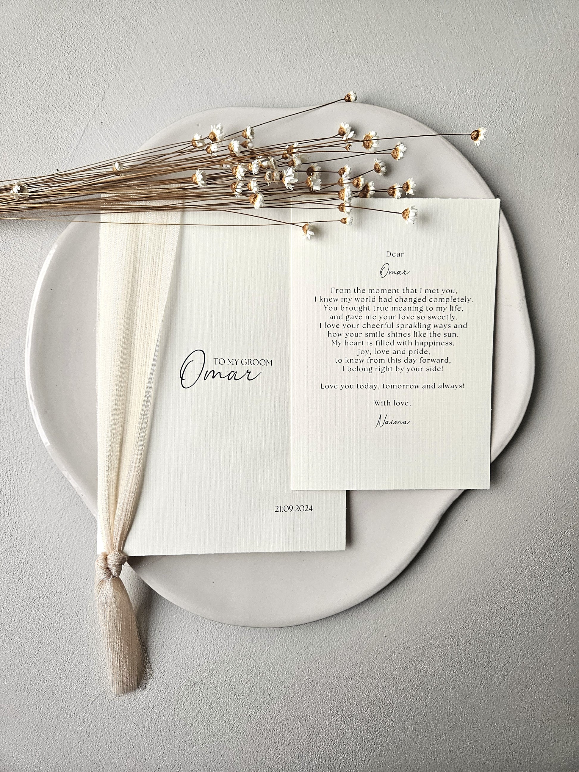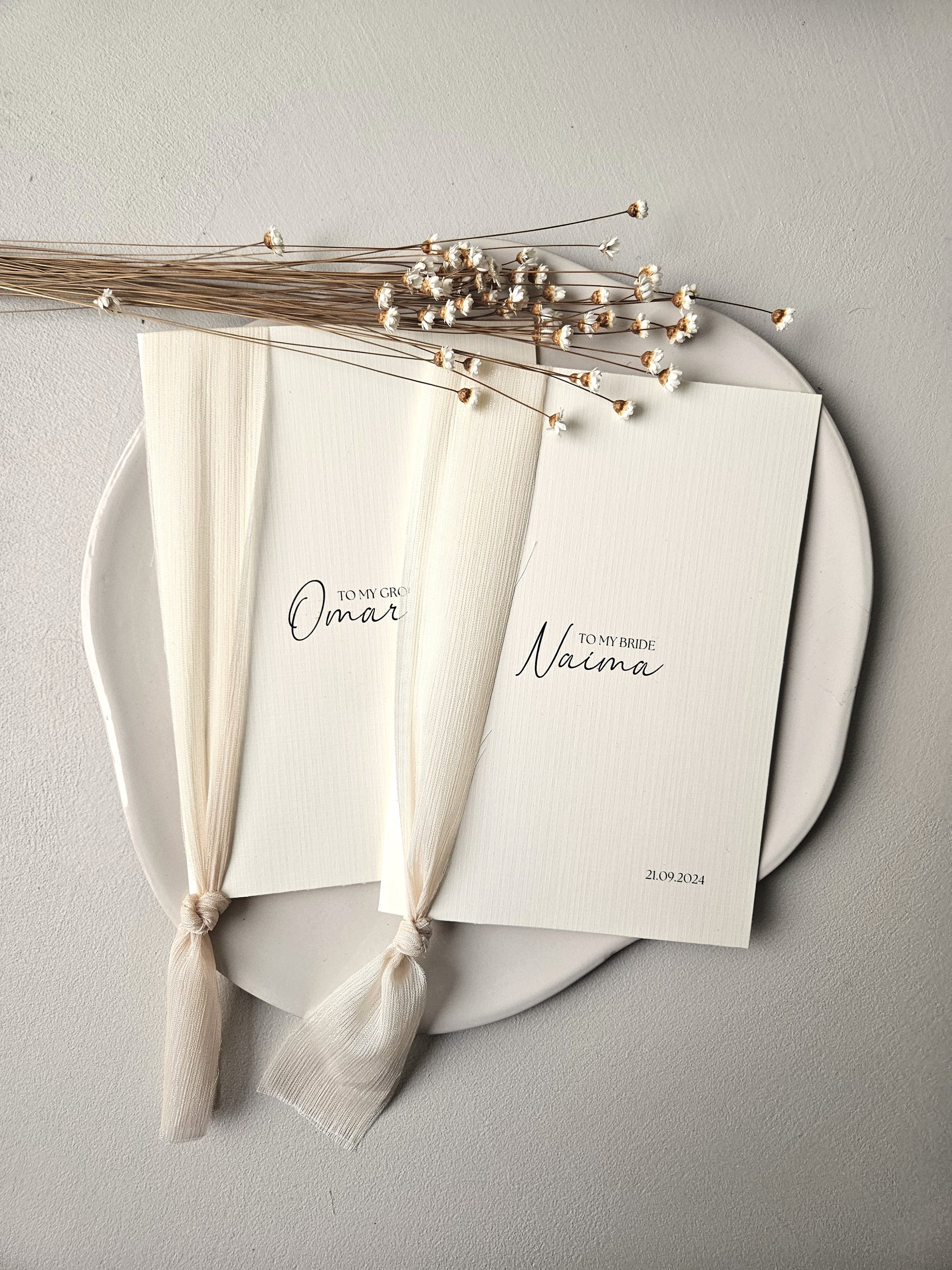 The letters are designed in the soft, pure style of Safha of Linnen, with calming hues, natural textures, and a timeless look. They are meant to be given to each other at a special moment before, during, or after the wedding, as a tangible reminder of your promise, love, and connection.