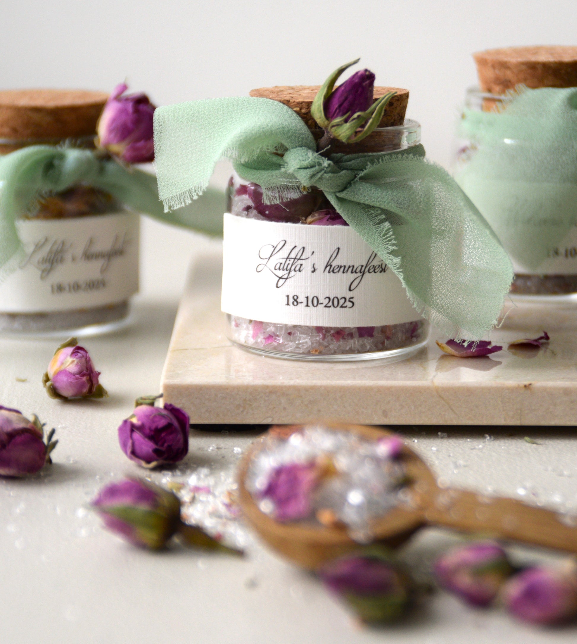 This charming bath salt favor from the Safha of Roses collection comes in an elegant jar with a cork lid. The jar is filled with fine bath salts, enriched with delicate rosebuds and leaves, for a luxurious and relaxing experience. A soft green ribbon and a personalized label complete the favor.