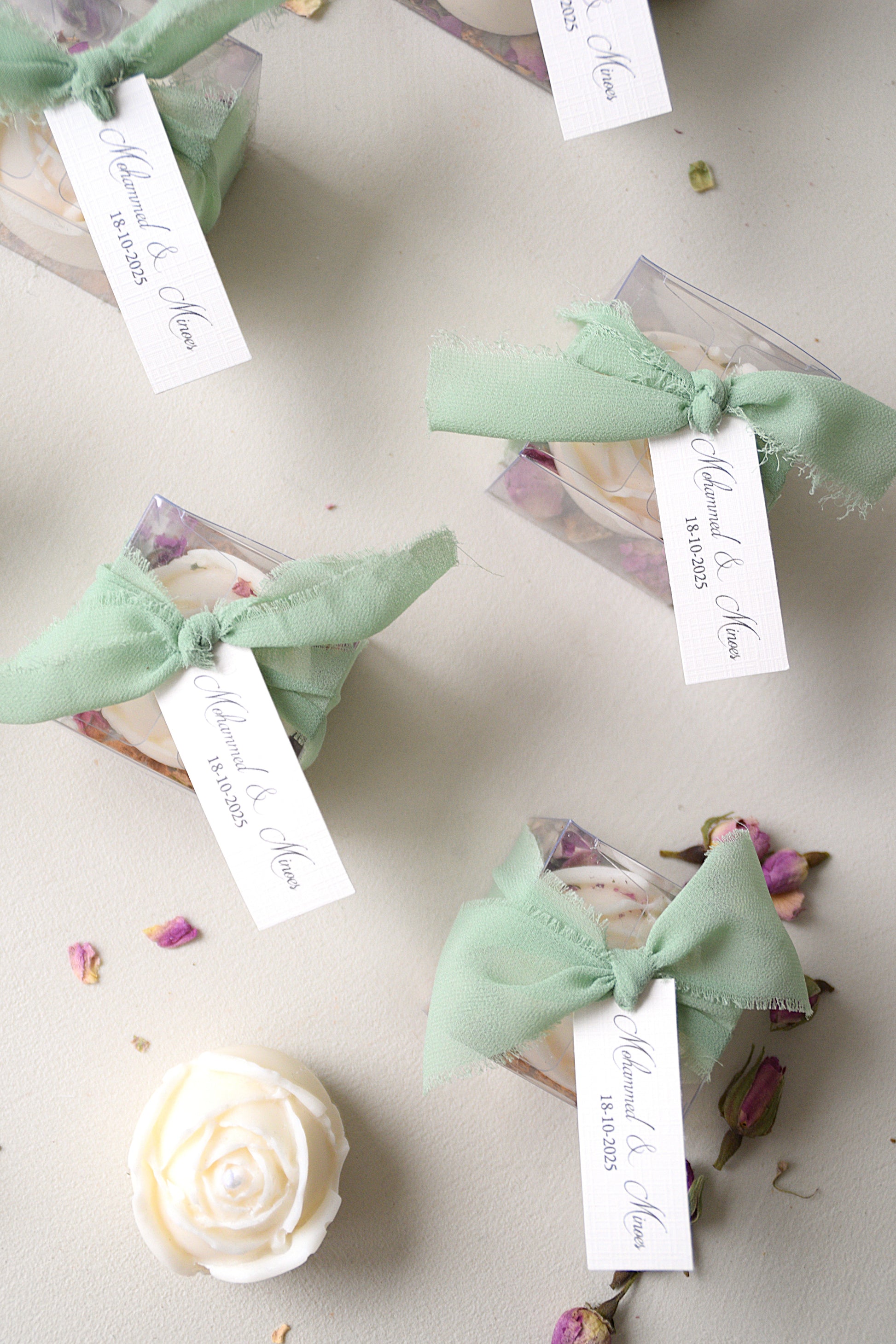 This beautiful rose-shaped candle favor from the Safha of Roses collection is an elegant and atmospheric gift for your guests. Packaged in a transparent box and tied with a soft green ribbon, real rosebuds and leaves sparkle beneath the candle, perfectly enhancing the romance of the collection.