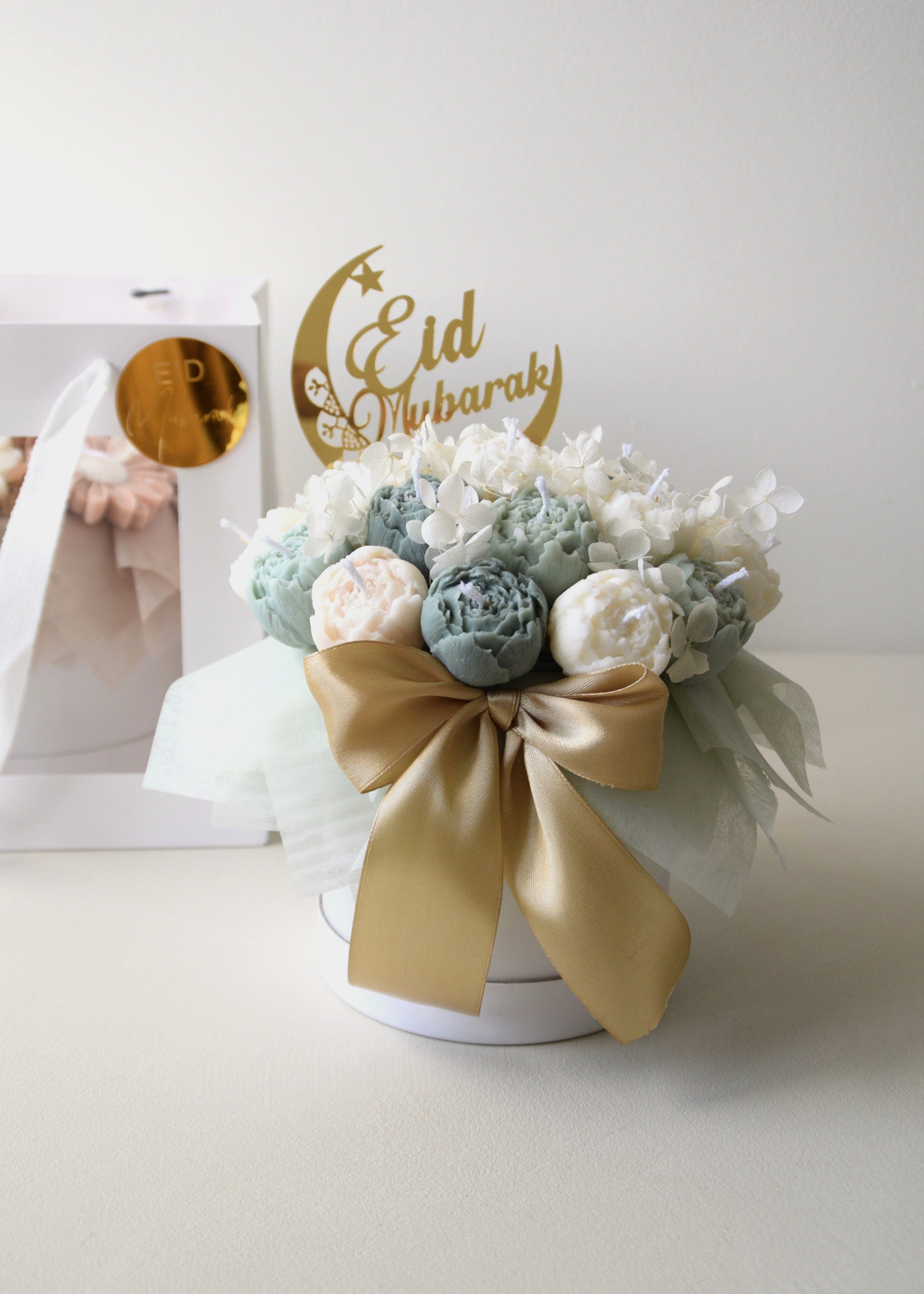 De kaarsenbox uit de Safha of Ramadan & Eid collectie is een ode aan licht, dankbaarheid en samenzijn. De box bevat met zorg gevormde kaarsbloemen. Verkrijgbaar in verschillende zachte kleuren, die sfeer en elegantie brengen in elk interieur. Elke box wordt gepersonaliseerd met een gouden “Eid Mubarak” topper.